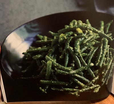 Green Beans with Pistachio Pesto: This was very easy to put together. It has the same elements as any typical pesto. Remember when I said that I didn’t have a food processor? I actually have one but it’s very small. This recipe called for the pesto to be blitzed together using an immersion blender, but I used my tiny micro-food-processor. It turned out great! Basically after you make this pesto you just mix it with green beans cooked to your personal preference. In the intro to this recipe, she goes so far as to say don’t even use this pesto recipe, just use store bought. Which my feeling is, why say that in a cookbook? Why even make anything in here? What is existence?
