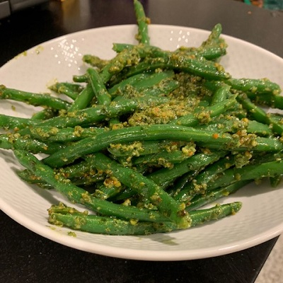 Do it taste good? I can’t review this without also stating that pesto sauce was the muse in creating this blog. I once tried the whole30 diet and made spaghetti squash with sausage and pesto for dinner and it looked like barf. But it tasted divine! I liked this recipe and I think that it is an easy way to punch up a side dish of regular green beans. You can even use store bought pesto!