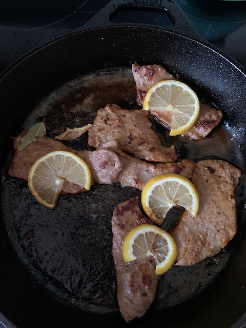 Veal Picante: I have never cooked veal before, and I think it may be a meat that is a bit dated. I found a small package of veal at the butcher counter, but it was prepackaged a bit like bacon, so it tells me that this is a meat that does not fly off the shelves these days. I guess Cooking Light likes veal for its leanness, and because this is a special meal for two it was on the pricey side. This veal meal was dredged in flour and then pan fried. the pan was then deglazed with water, vinegar, and brown sugar. You then put lemon slices on top to make it look better.